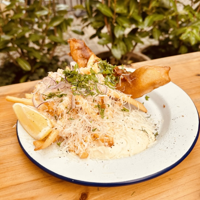 Hann äta glutenfri fish & chips på Hasselssons. Också värt en omväg. De har en separat fritös för glutenfritt. Plus att de har riven italiensk ost på alla fries. Vän av ordning undrar varför det inte finns mushy peas? Jaha.