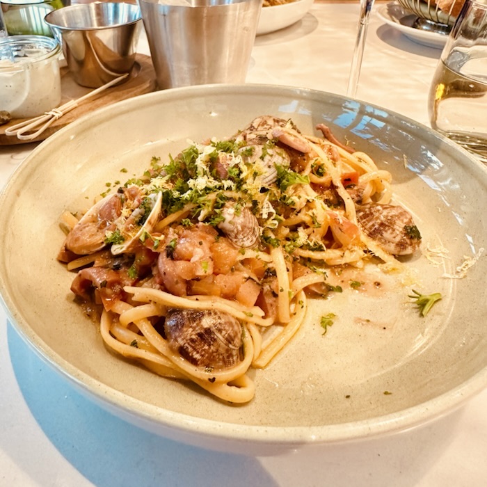 Onsdag: jag åt på Grand Soleil bredvid innan ”Så tuktas en argbigga” på Dramaten. Vongolepasta. Blev jättenöjd. Gänget hemma hade restfest.