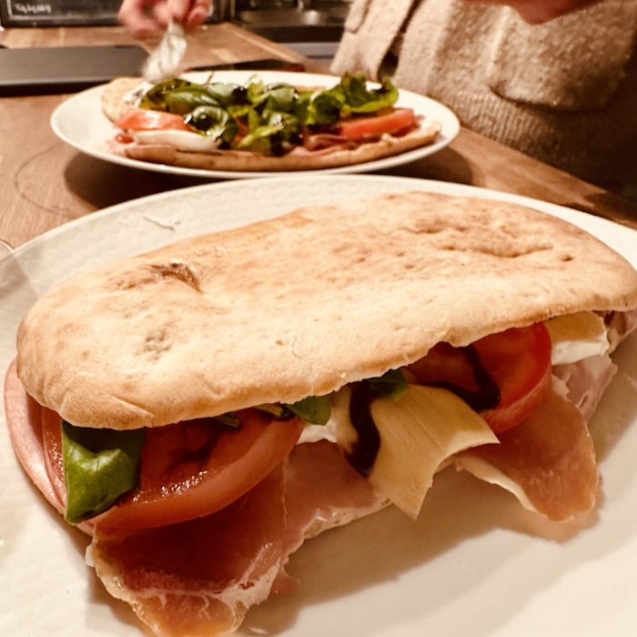 Fullt möjligt att vi skannade av menyn hos Bar Schiacciate för receptidéer. Var helt på det klara med att mortadella och stracciatella hade en viktig plats. Och en riktigt stor bifftomat för att hålla ihop allt. Vad vi inte har hemma – en paninipress! Borde kanske köpa det endå? Gillar inte när köket blir en maskinpark men kanske behöver en? Oavsett ett härligt bröd att fylla upp med skafferiets antipasti när man inte orkar laga middag.