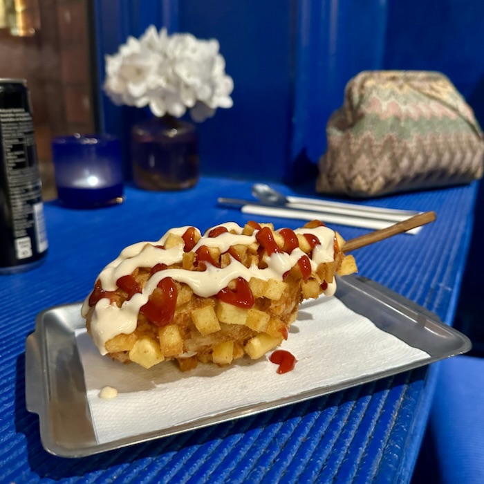 Här finns potatistärningar som extra topping på corn dogs, och går att beställa med mozzarella och/eller korv.