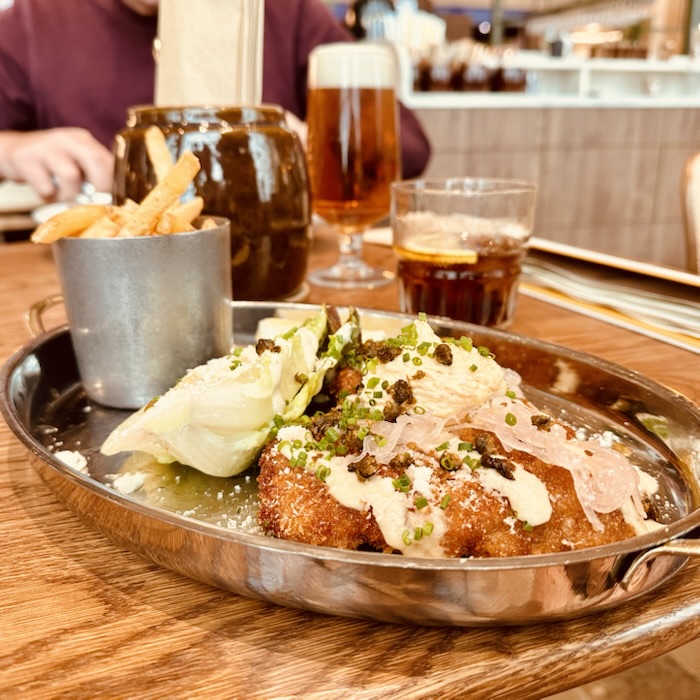 Åt en otroligt GOD kalvsnitzel med parmesansmör och friterad kapris. Maken blev nöjd med deras biff och bearnaisesås. Plus hann med en fin cortado efter maten.