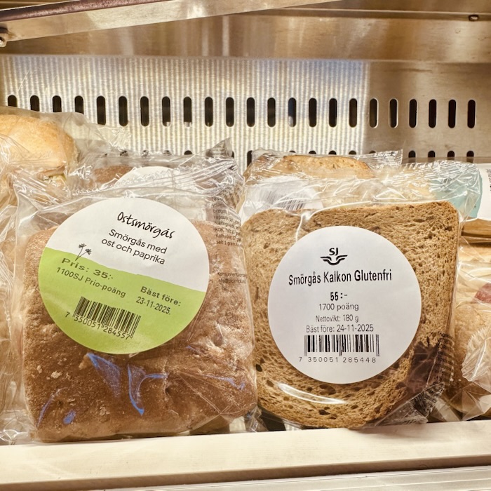 SJ och den tråkiga prissättningen. Znark. Notera även det trasiga brödet. Hade tur nog back -up av en kesoburk från Pressbyrån i vanlig ordning.
