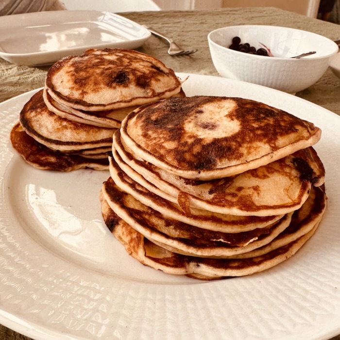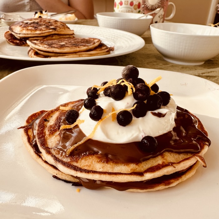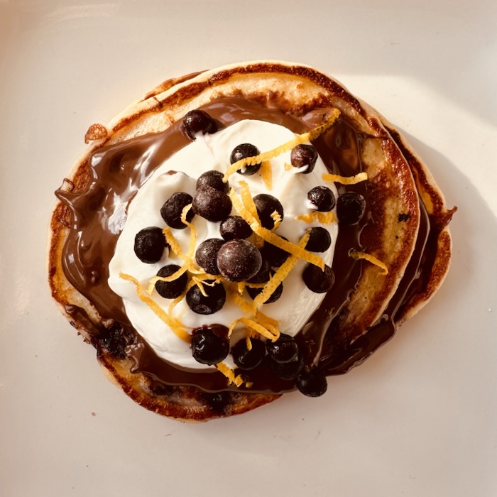 Eller kanske blåbärspannkakor med ricotta. Same same. Goda oavsett. Toppa med vaniljkvarg, nötkräm, ännu mer blåbär och citronzest.