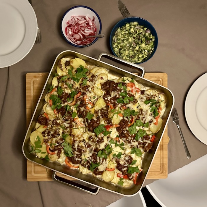 Fastnade för receptskissen Irish Nachos. Osäkert på hur irländskt det är men bra vardagsmat när det finns en chili i frysen. Det är i princip som att byta ut nachos till skivad potatis, när man vanligtvis gör någon slags matig nacho-tallrik.