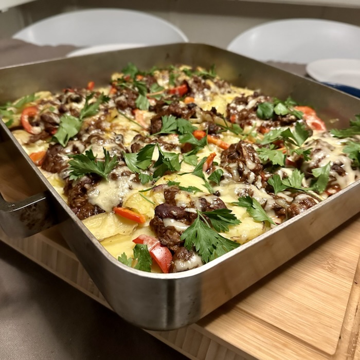 - Lägg på tidigare tillagad chili. Skiva över röd paprika. Riv över ost. Gratinera i ugnen.
