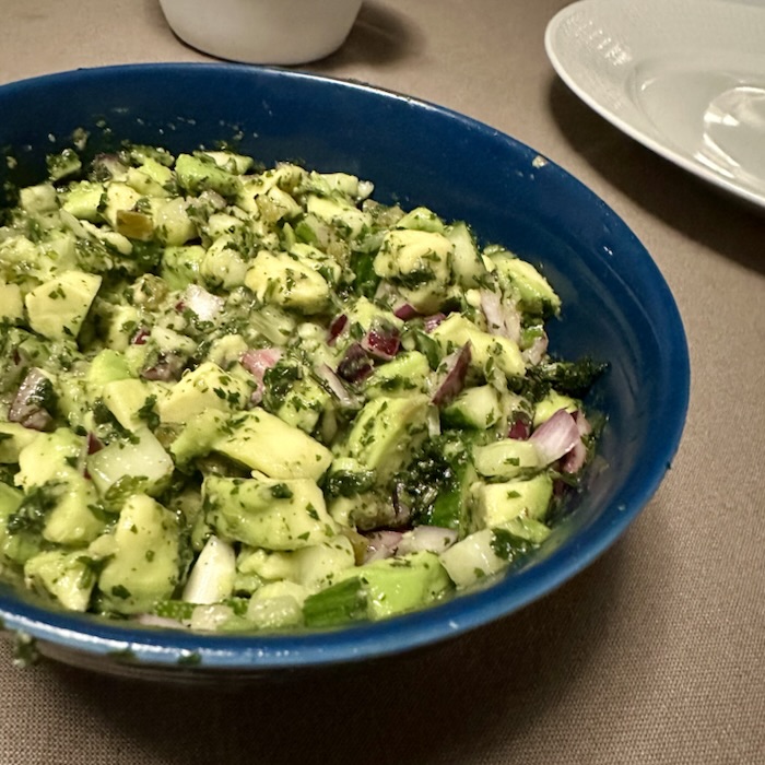 - Tärnad avokado och tärnad gurka – ungefär lika mycket av vardera.